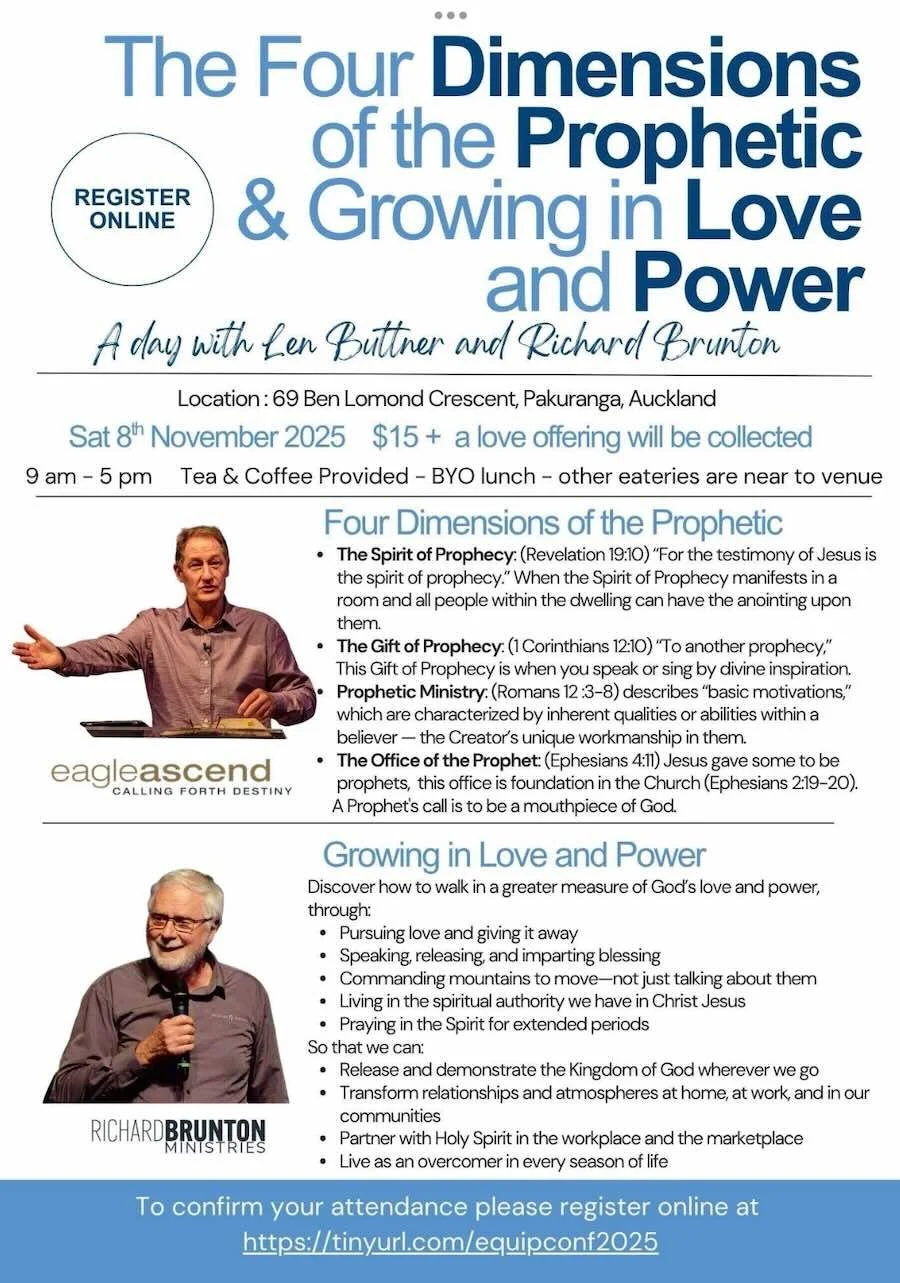 Prophetic Training with Len Buttner & Richard Brunton, Auckland Saturday, November 8, 2025 9:00 AM 5:00 PM 09:00 17:00 Google Calendar ICS